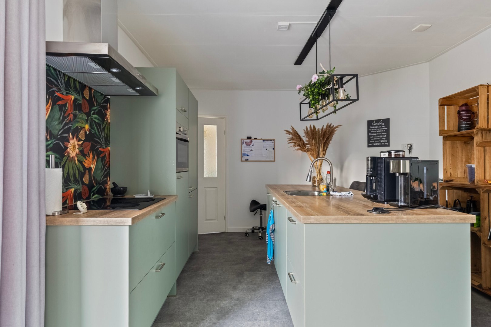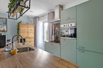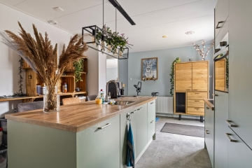 Aan de achterzijde bevindt zich de uitgebouwde open keuken met vrijstaand kookeiland en moderne inbouwapparatuur: een vaatwasser, koelkast met vriezer, inductiekookplaat en combi-oven. Vanuit de keuken stap je zo de tuin in.