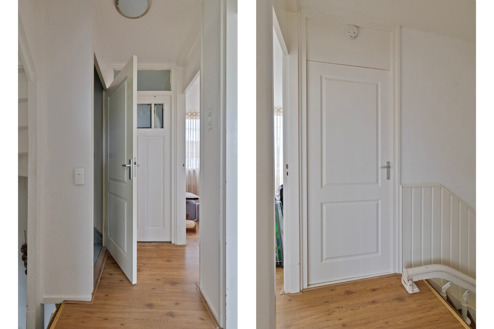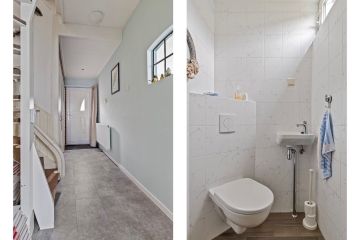 Via de entree met inbouwkast en meterkast (7 groepen en aardlekschakelaar) bereik je het toilet met vaste wastafel en de trapopgang naar de eerste verdieping.