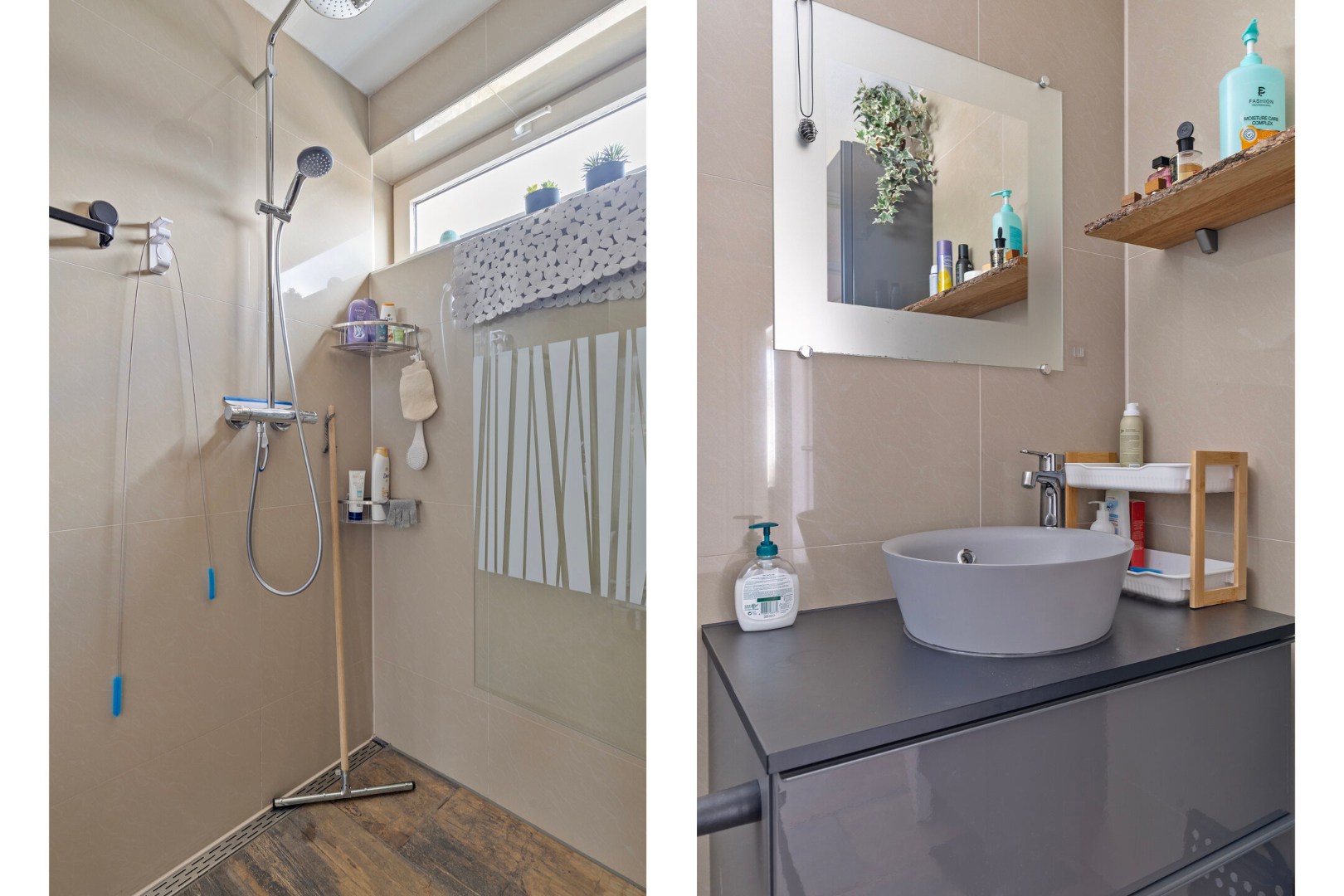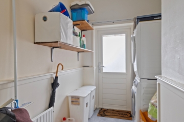 Aansluitend is er een praktische bijkeuken, voorzien van witgoedaansluitingen, lambrisering en een deur naar de overkapping en tuin.